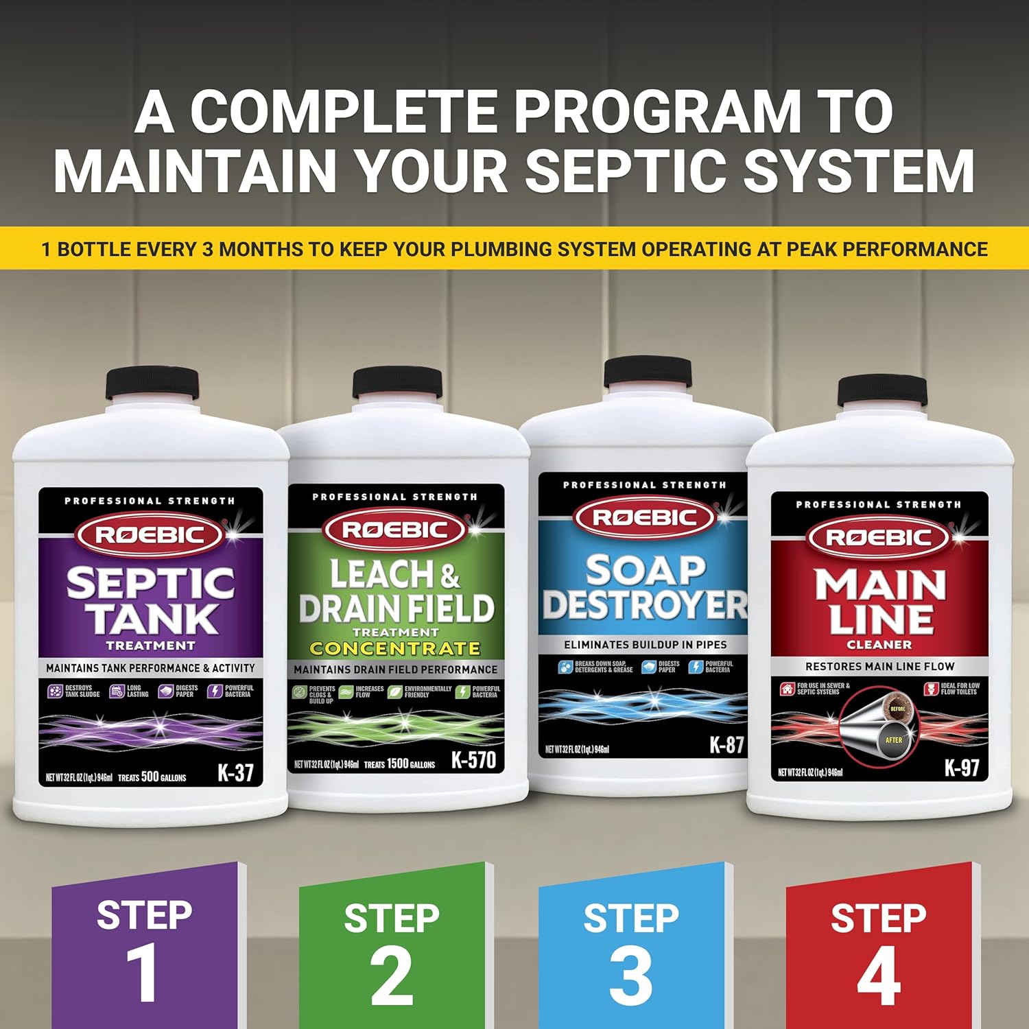 - Roebic, 32oz main line sewer/septic cleaner, concentrated bacterial waste degrading product for any sewer line, clears fats, grease, sludge, & paper, for any household use, whether septic system or sewer.