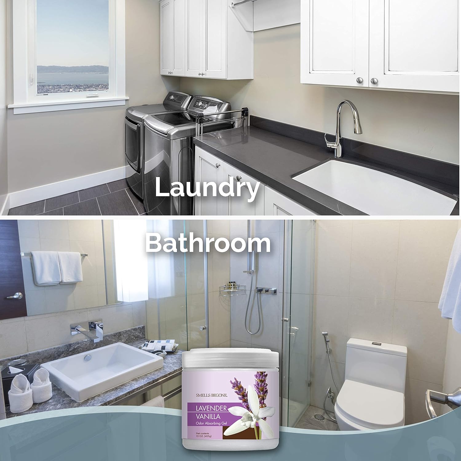 SMELLS BEGONE Air Freshener Odor Absorber Gel - Absorbs Odor from Bathrooms, Cars, Pet Areas, Boats and RVs - Made with Essential Oils - Lavender Vanilla Scent - 15 Ounce