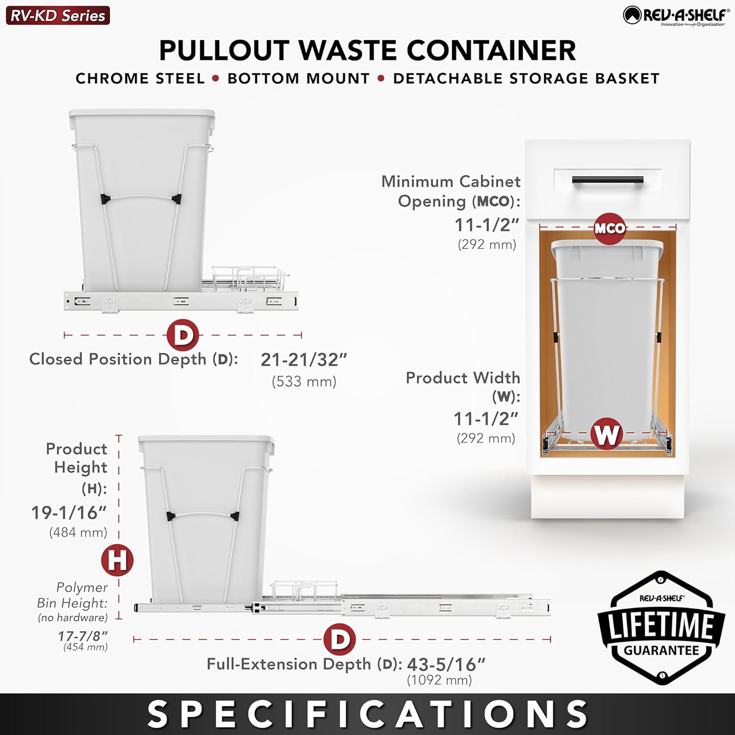 Rev-A-Shelf RV-12KD-18C S 35-Quart Chrome Wire Bottom Mount Pullout Kitchen Waste Trash Can Container Bin with Rear Storage, Black
