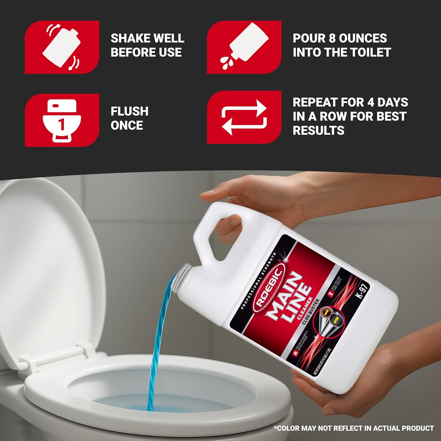- EASY TO USE: Our main line cleaners are easy to use, simply shake well, pour 8 ounces into the toilet and flush once. For best results, repeat for 4 days in a row. Repeat application every 6 months or as needed