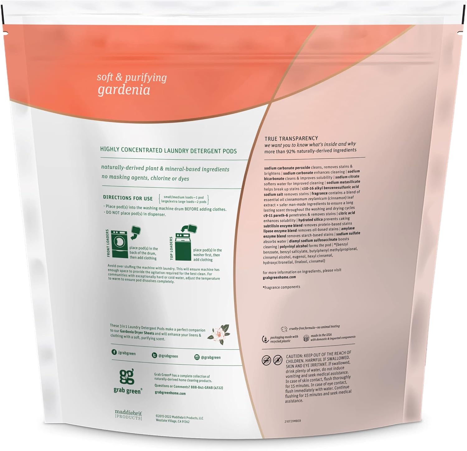 - Contains: 1- 132 Pod Bag of Grab Green Natural Gardenia 3in1 Laundry Detergent Pods. Our velcro closure bags are convenient and easy to use, no hassling with frustrating zip closures