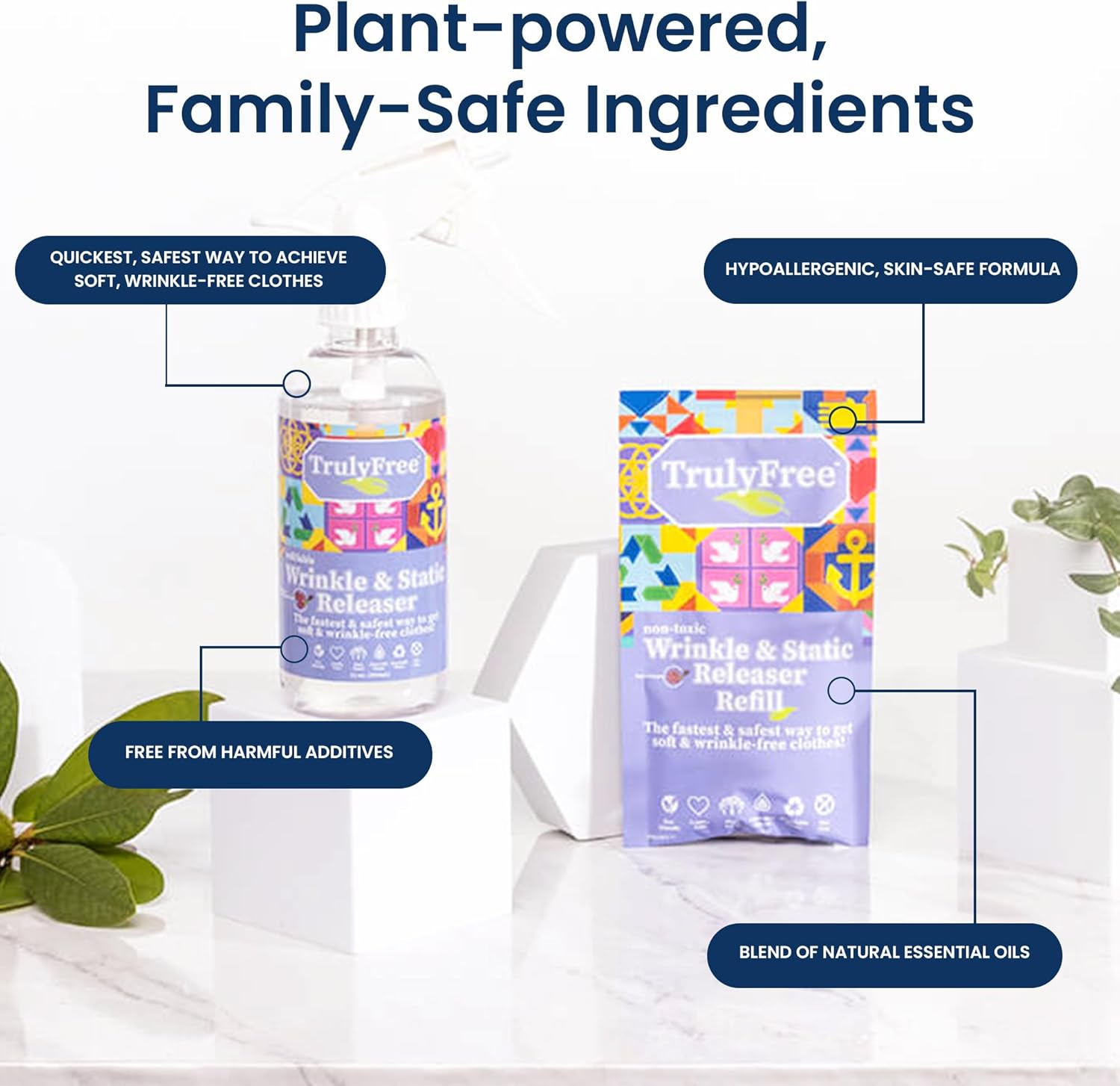 Truly Free Wrinkle & Static Releaser - Wrinkle Release for Clothes, Linen, & Sheet Fabrics - Static Guard Spray - Plant-Based - 1 Pouch 3oz Refill with 12oz Reusable Empty Spray Bottle