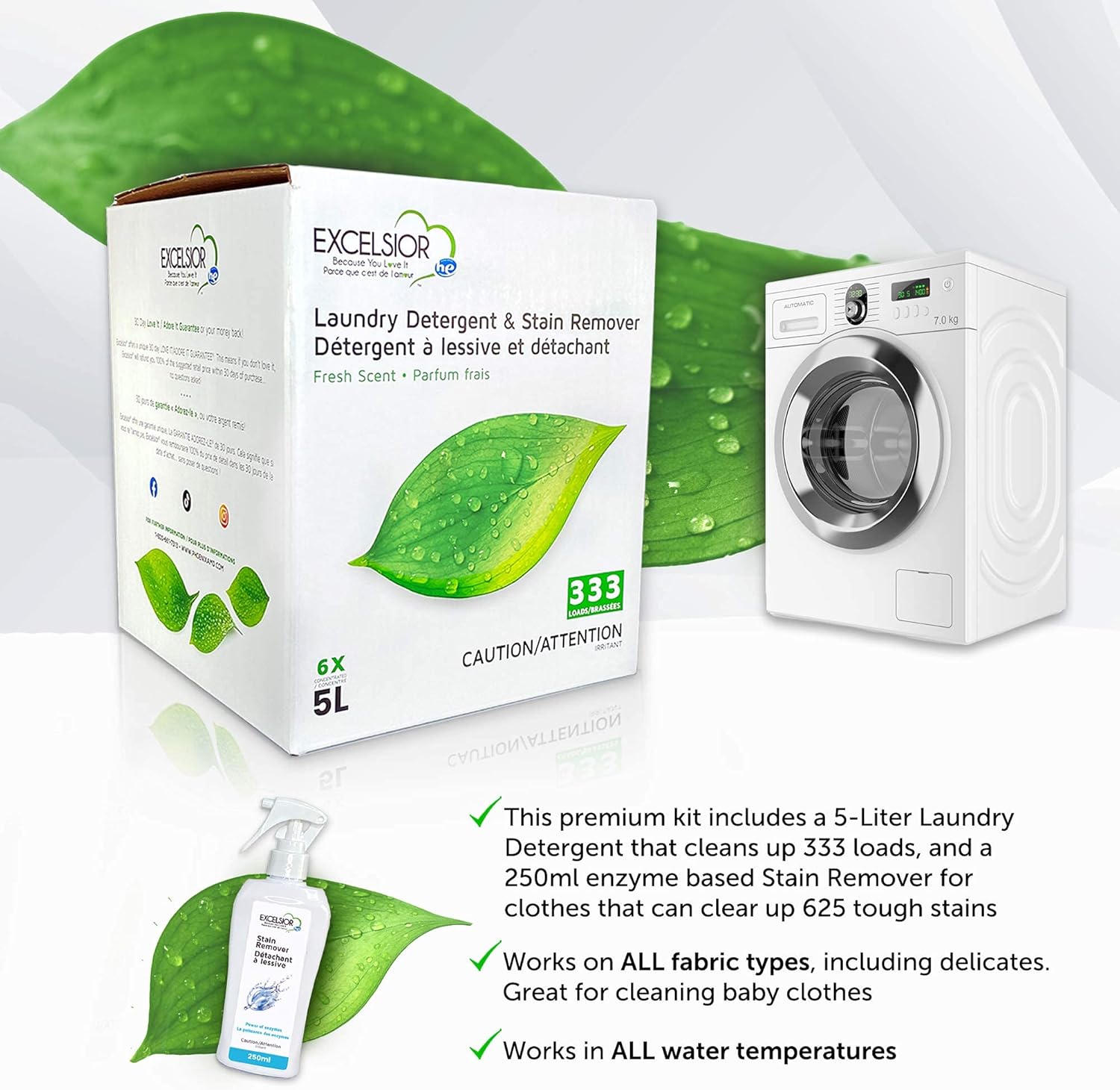 Excelsior HE Concentrated Liquid Laundry Detergent with Stain Remover, Removes 333 Loads for Cleaning Clothes, Phosphate-Free, Solvent-Free, Fresh Scent, 5L…