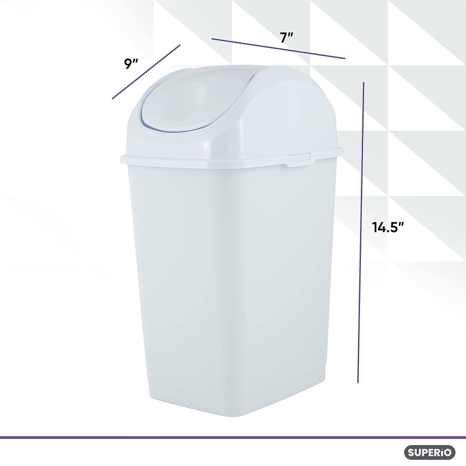 Superio Small 2.5 Gallon Plastic Trash Can with Swing Top Lid, Compact Slim Waste Bin for Under Desk, Office, Bedroom, Bathroom, Dorm Room, 10 Qt. Portable Garbage Can (White)