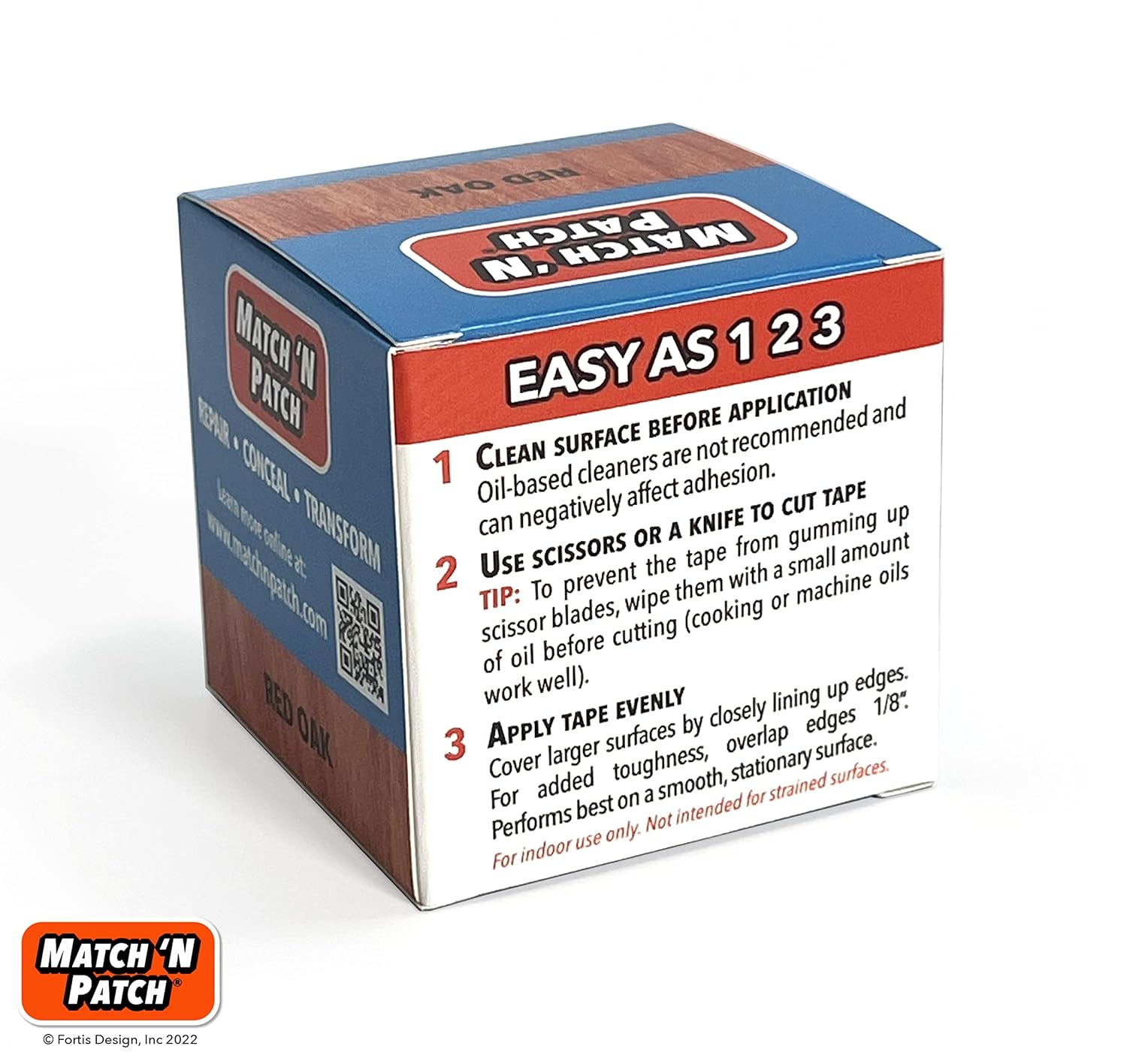 - MATCHING OPTIONS AVAILABLE: The Red Oak pattern is part of a broader collection, available in a larger size for extensive repair needs. Visit the MATCH ’N PATCH Store to explore all 13 wood tape shades and find the perfect match for your project.