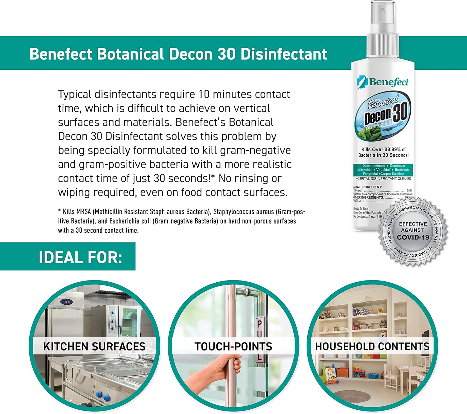 - SAFE & EFFECTIVE: Benefect Decon 30 is safe for use on food-contact surfaces without the need for rinsing or wiping. It’s the ideal choice for restoring water damage in the kitchen or combating a school virus outbreak.