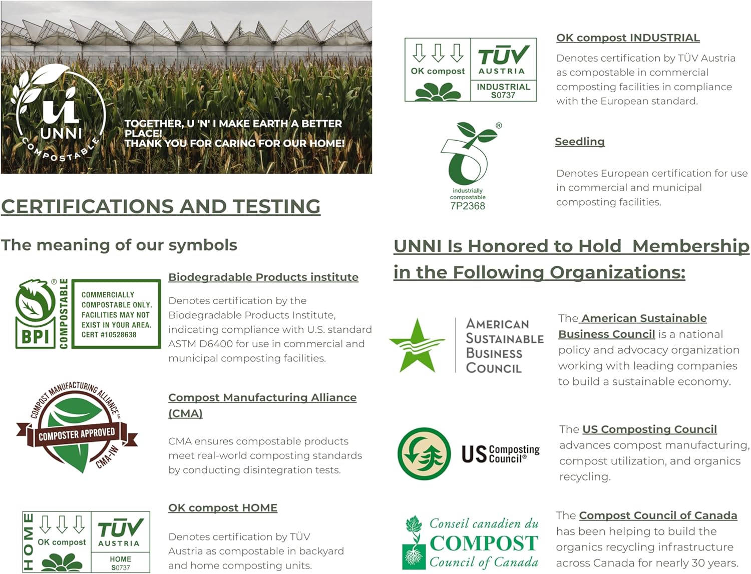 - Certified Compostable — Independently certified by BPI (U.S., to ASTM D6400), CMA (field-tested in operating facilities), and OK compost HOME by TÜV AUSTRIA (home/backyard).