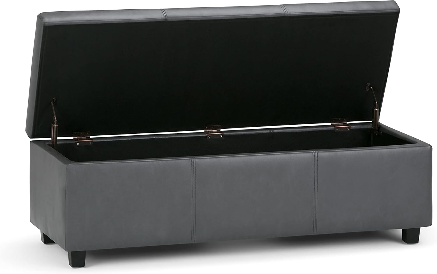 SIMPLIHOME Avalon 48 inch Wide Contemporary Rectangle Storage Ottoman Bench in Stone Grey Vegan Faux Leather, Assembled, For the Living Room, Entryway and Family Room