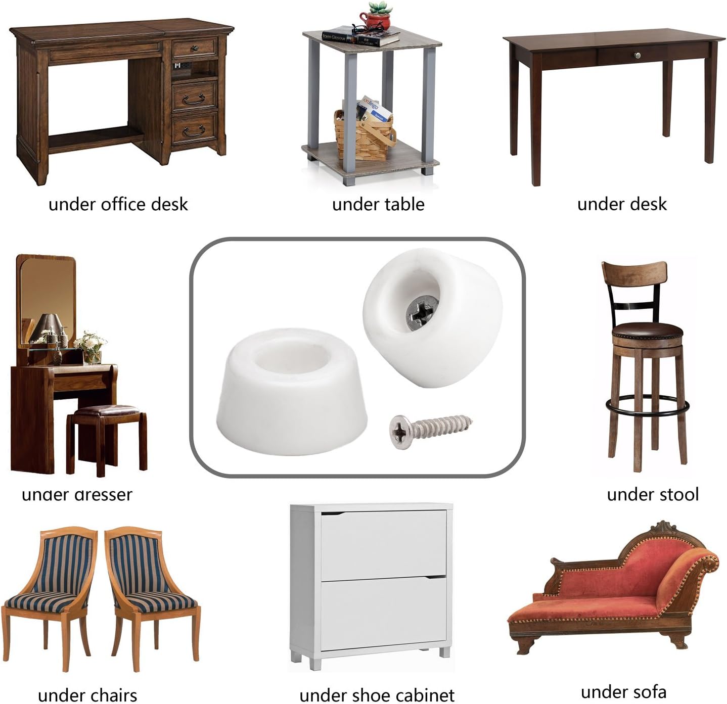 - Can be used under the leg or feet of dresser,table,cabinet,dining room chair,sofa,couch,footrest,barstool,shower bench,desk leg tips,cutting board,walking sticks.