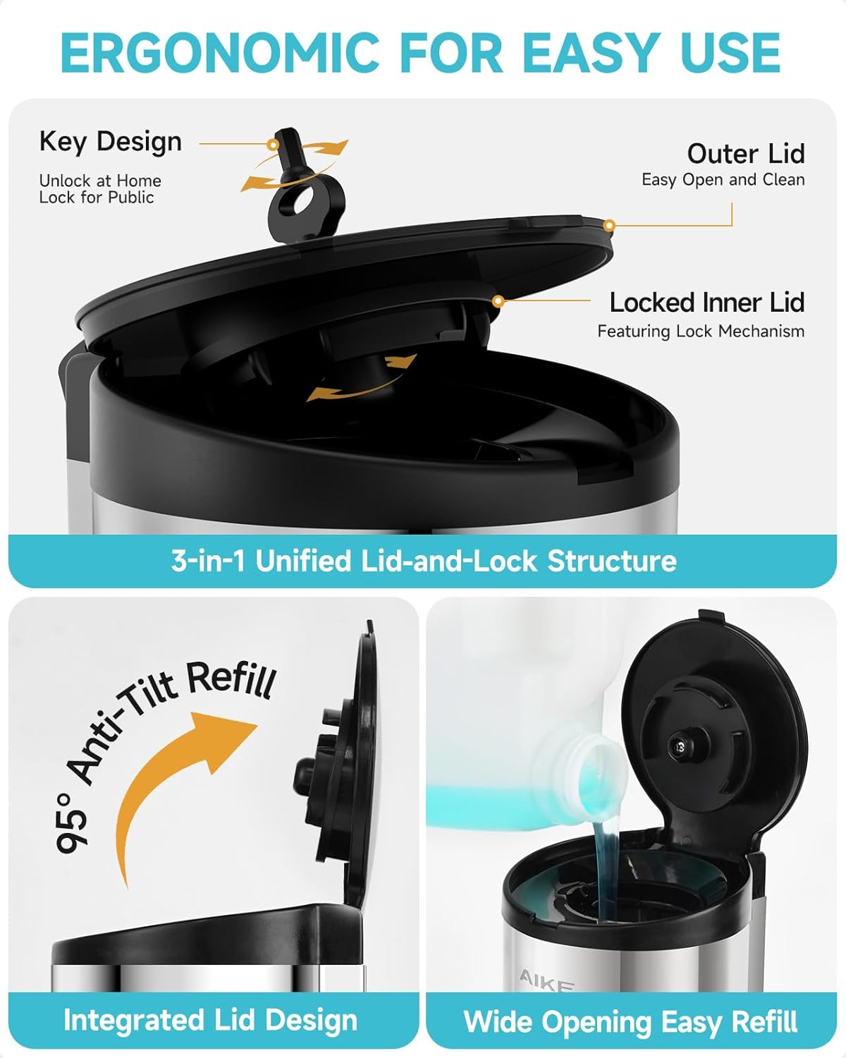 - Ergonomic design—3-in-1 integrated lid-lock mechanism for simultaneous locking. The 95-degree one-piece lid prevents liquid tipping during filling