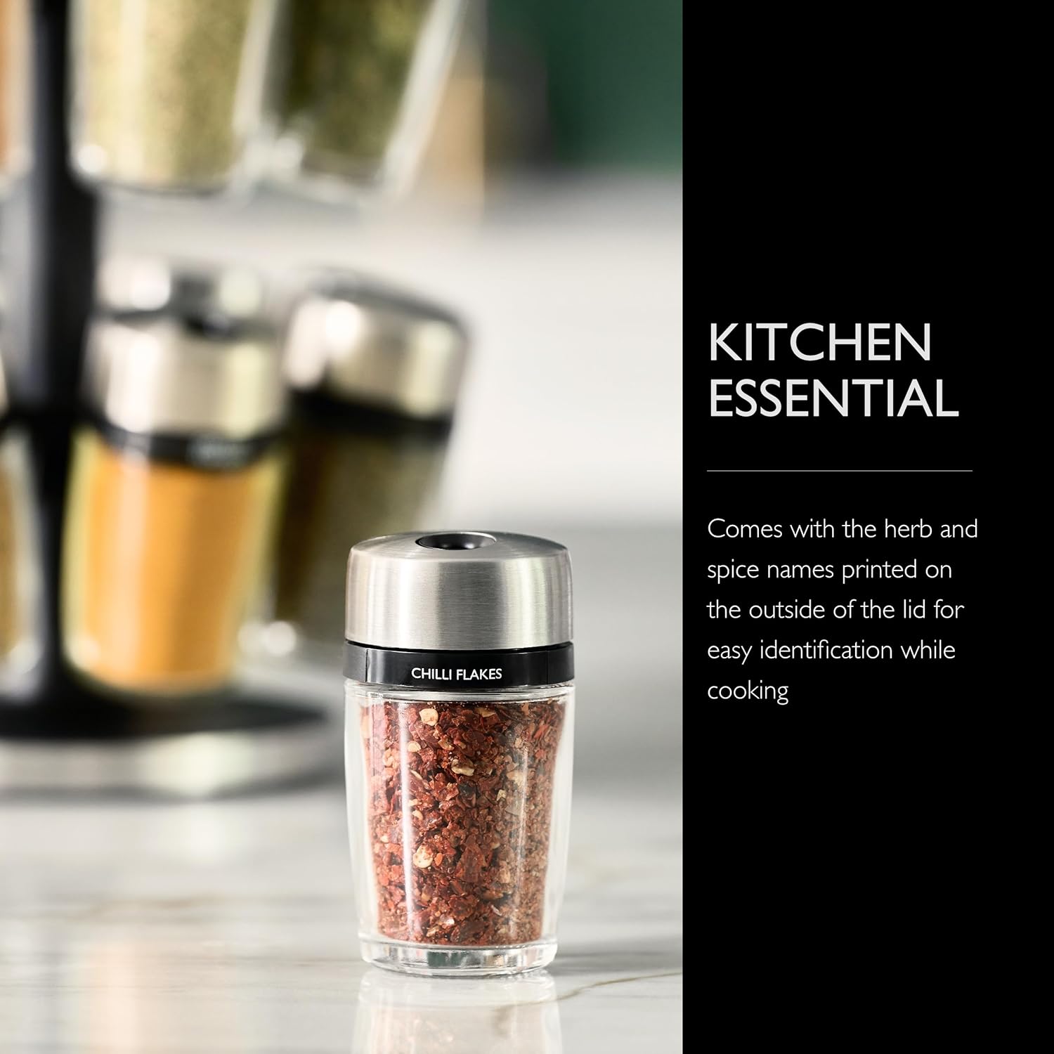 - Spice Rack with Jars: Keep this spinning spice rack tidy with stainless steel caps and spice labels