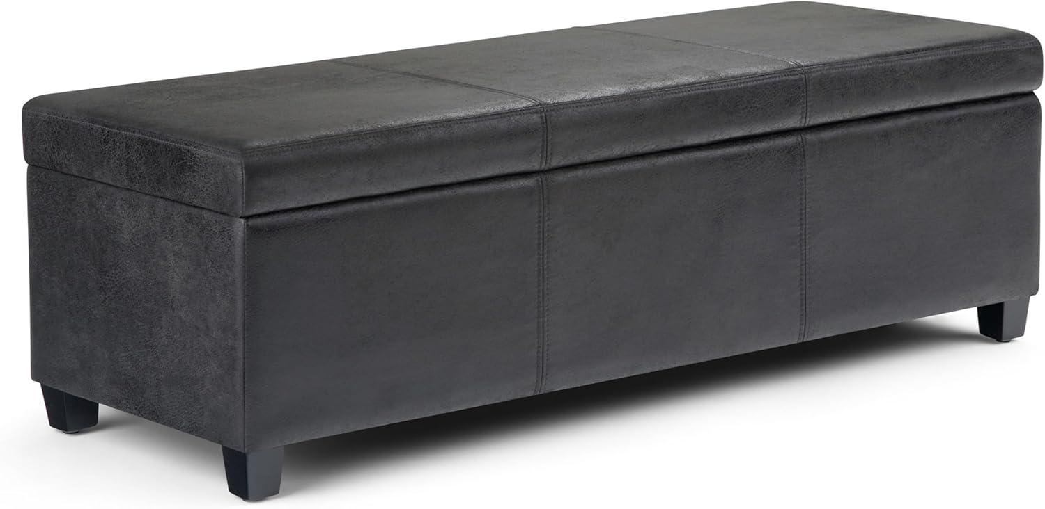 SIMPLIHOME Avalon 48 inch Wide Contemporary Rectangle Storage Ottoman Bench in Distressed Black Distressed Vegan Faux Leather, Assembled, For the Living Room, Entryway and Family Room