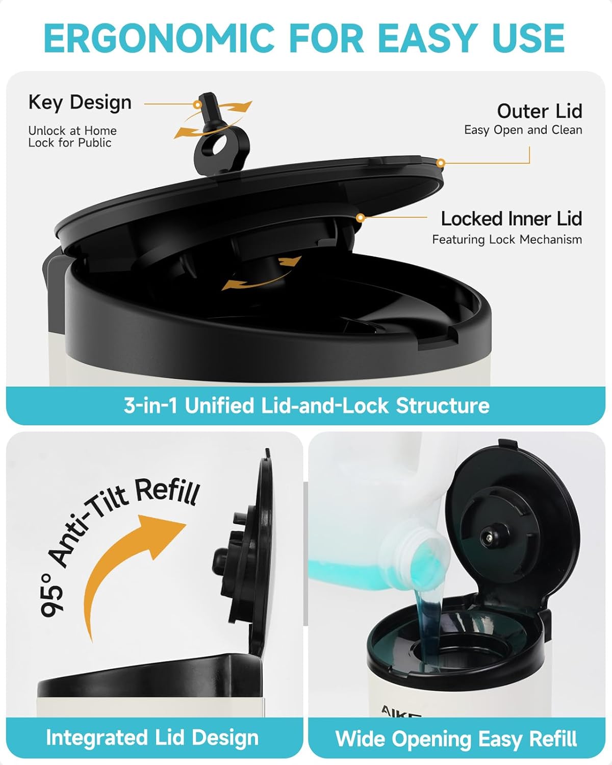 - Ergonomic design—3-in-1 integrated lid-lock mechanism for simultaneous locking. The 95-degree one-piece lid prevents liquid tipping during filling