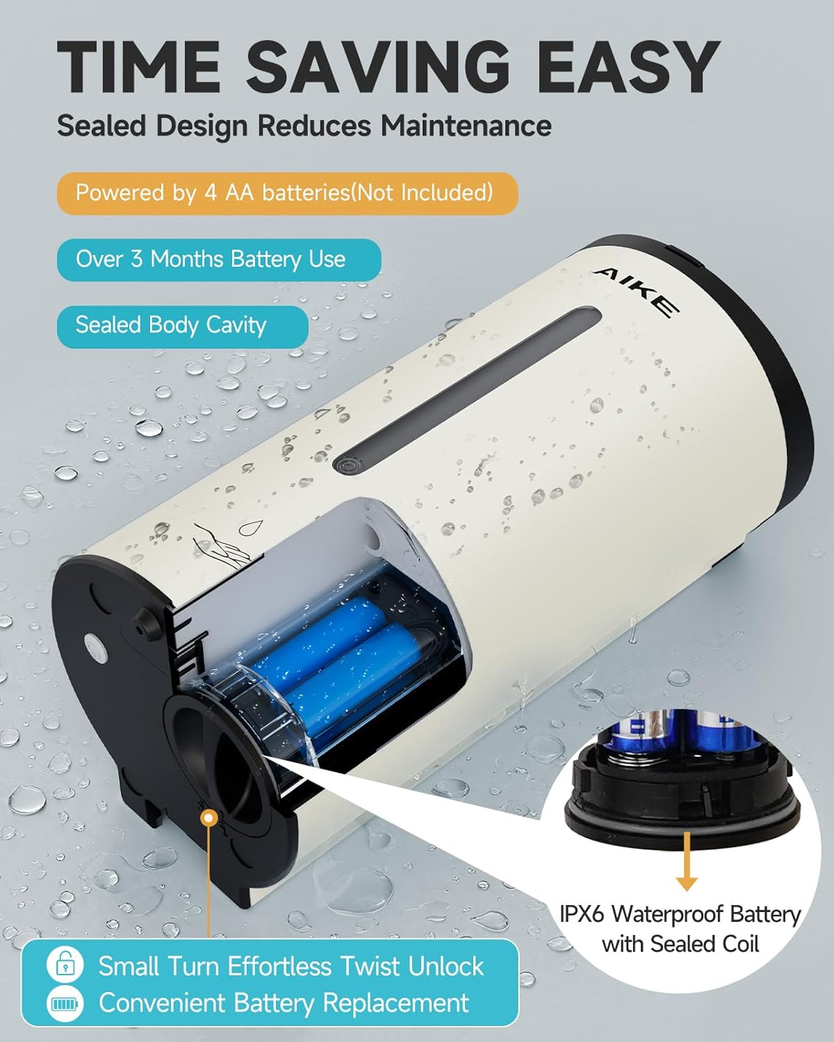 - Time-Saving: Powered by 4 AA batteries (not included). The sealed waterproof cavity and battery compartment with waterproof coil ensure long standby and easy maintenance