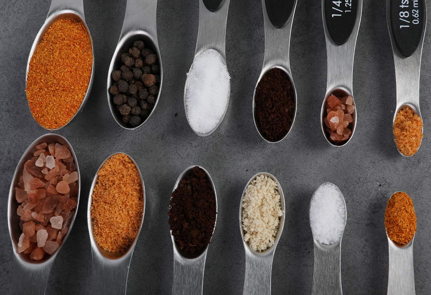 - ESSENTIAL MEASURING SPOONS for KITCHEN - These 6 individual different sized stainless steel measuring spoons(1/8-tsp, 1/4-tsp, 1/2-tsp, 1-tsp, 1/2-Tbsp. and 1-Tbsp) provide accurate measurements for your cooking and baking needs.