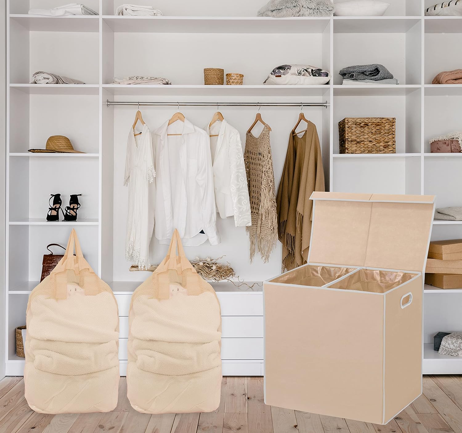 Simple Houseware Double Laundry Hamper with Lid and Removable Laundry Bags, Beige