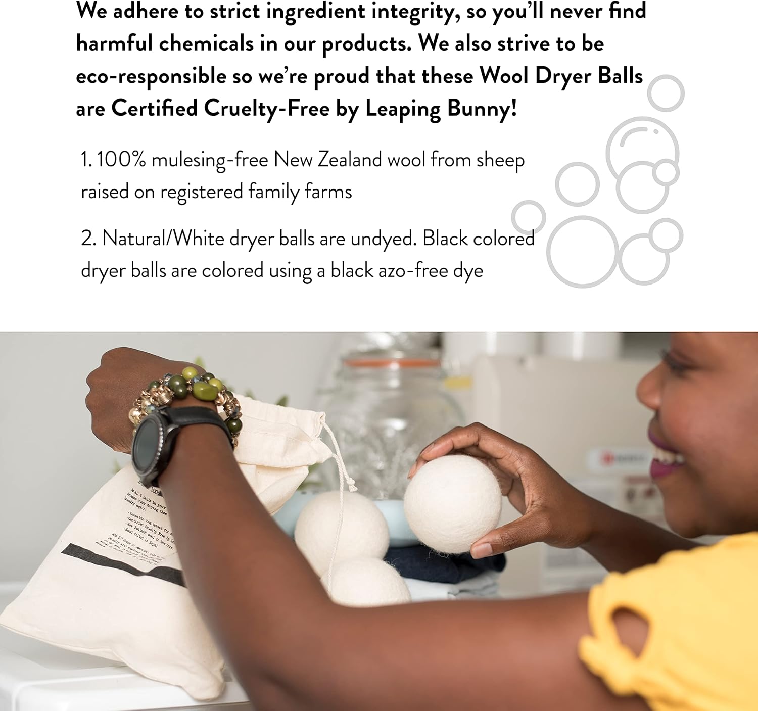 - CRUELTY-FREE: The wool for these dryer balls is sourced from small farms in New Zealand that practice humane farming and shearing techniques. These small farms are sustainable and eco-responsible, and the manufacturing processes are too. Certified cruelty-free by Leaping Bunny.