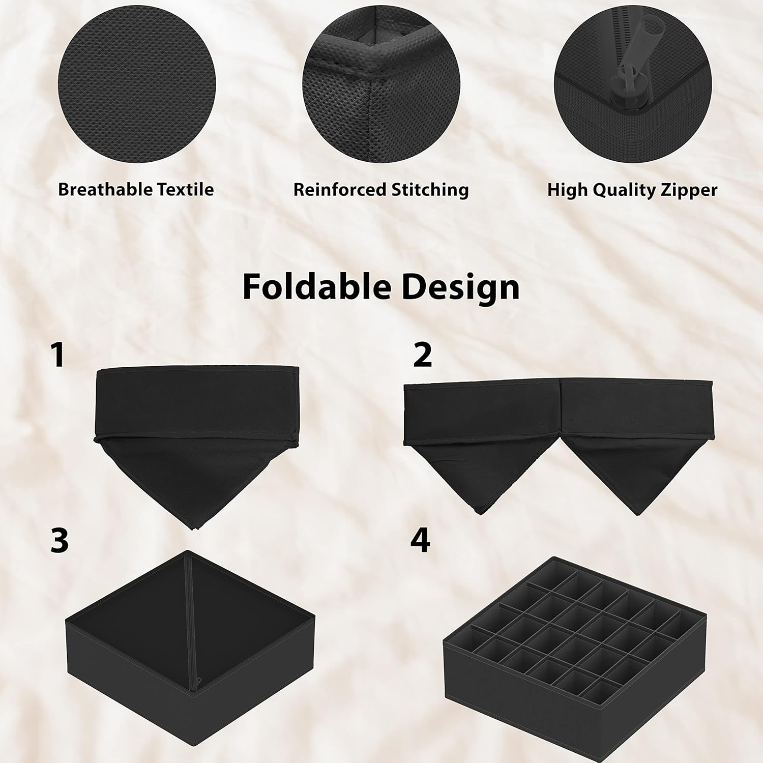 - 4 Versatile Organizers - Includes 6 cell(scarves, ties), 8 cell(underwear, briefs, ties), 7 cell(bra), 24 cell(socks) bins to neatly sort underwear, bras, socks, ties, and more