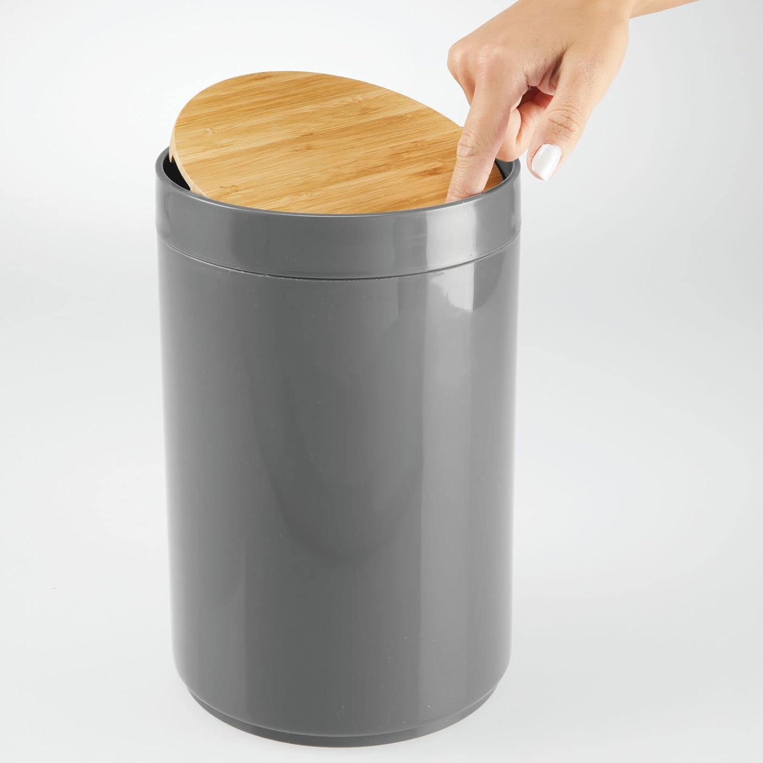mDesign Plastic Round Trash Can Small Wastebasket - Garbage Bin Container with Swing-Close Lid - Bathroom Garbage Basket - Holds Waste, Recycling - 1.3 Gallon - Basa Collection - Charcoal Gray/Natural