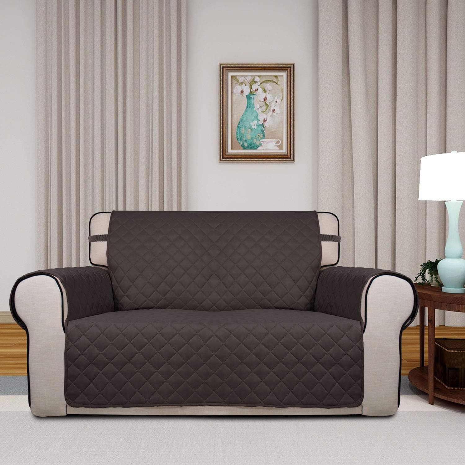 PureFit Reversible Quilted Sofa Cover, Water Resistant Medium Slipcover Furniture Protector, Washable Couch Cover with Non Slip Foam and Elastic Straps for Kids, Dogs, Pets (Loveseat, Chocolate/Beige)