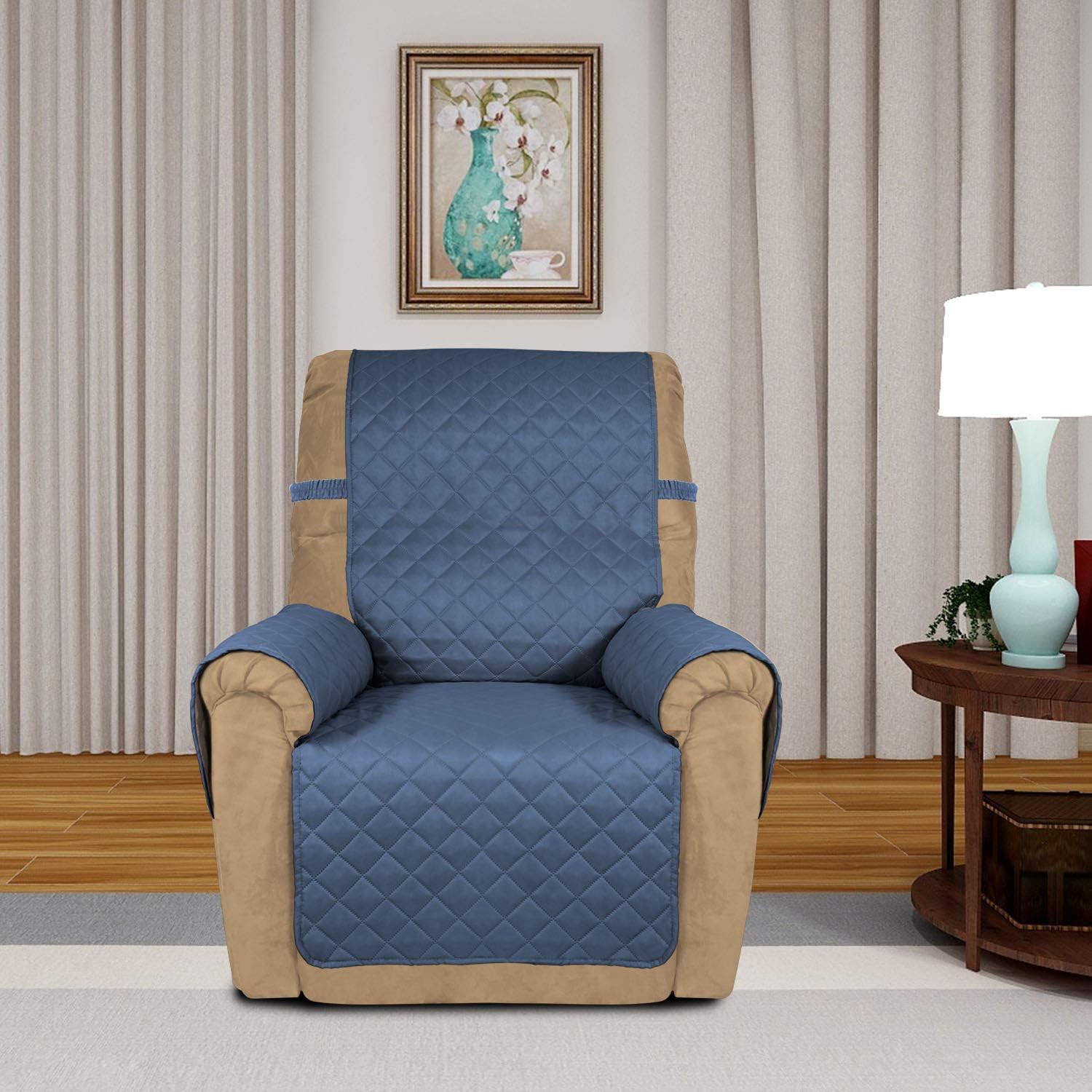 PureFit Reversible Quilted Sofa Cover, Water Resistant Slipcover Furniture Protector, Washable Couch Cover with Non Slip and Elastic Straps for Kids, Dogs (Small Recliner, Dark Blue/Light Blue)