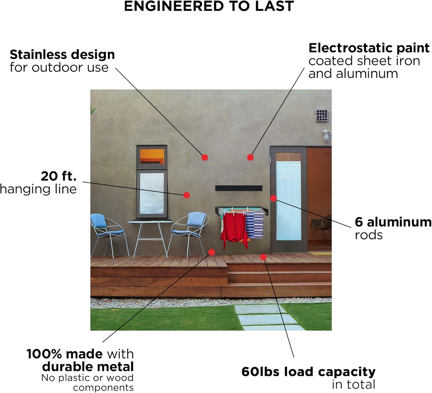 - LARGE DRYING SPACE & HEAVY WEIGHT CAPACITY: Our foldable laundry drying rack features 6 heavy-duty aluminum rods with 20 feet of linear hanging line and can hold up to 60 lbs weight.