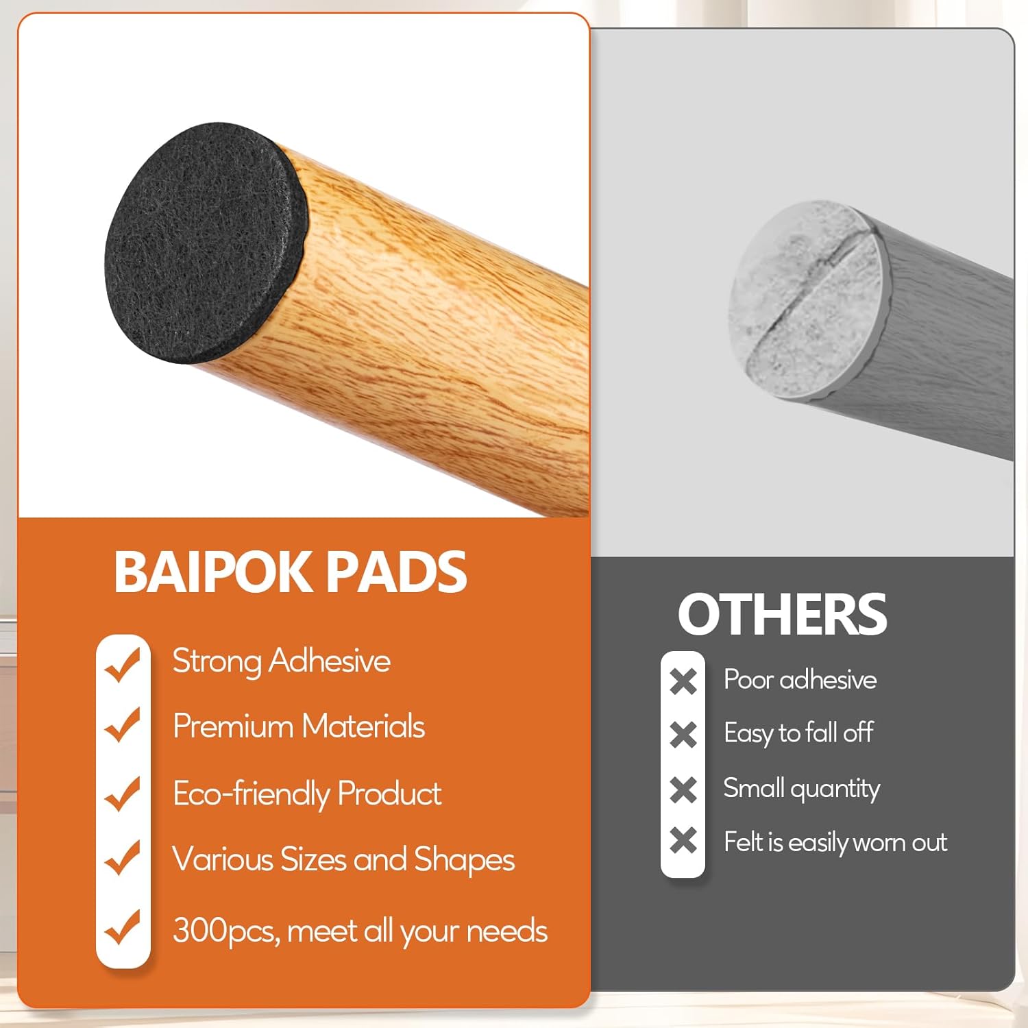 - [No More Scratching and Noise]: Place our felt furniture pads on the legs of your furniture, not only to minimize scratching but also to minimize the grating noise that comes with even the slightest movements of your favorite furniture. And you never have to hear that annoying scraping noise again