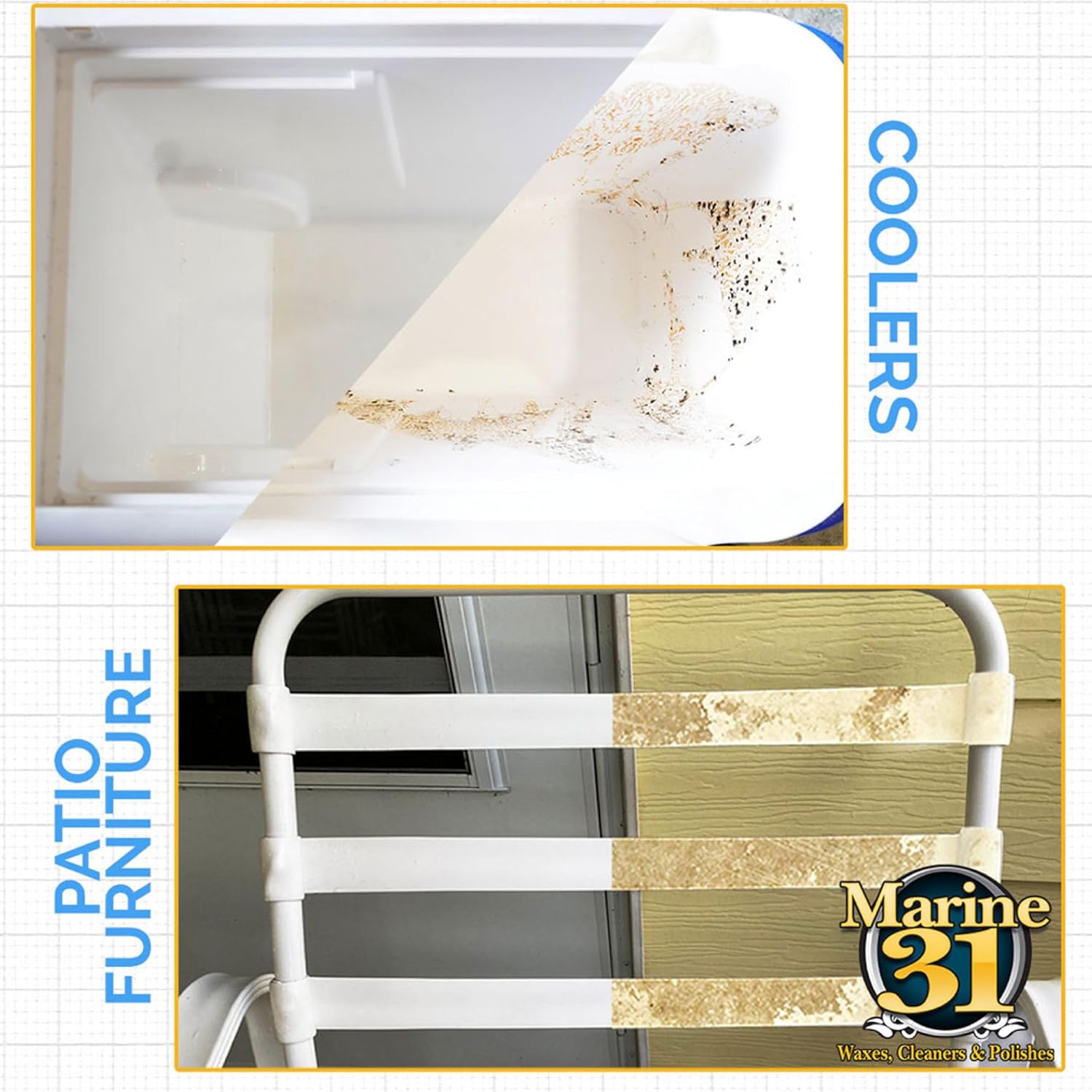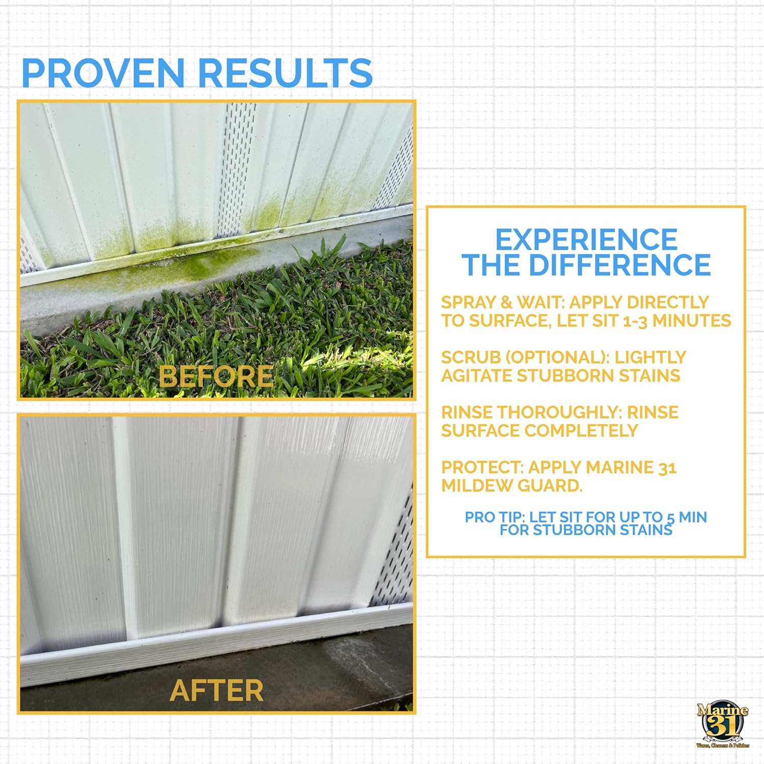 - MULTIPLE USES: Safe for Boats, Vinyl, Tile, Grout, Patio, Coolers, and just about anywhere else that may accumulate stains. Marine 31 Mildew Stain Remover works like no other!
