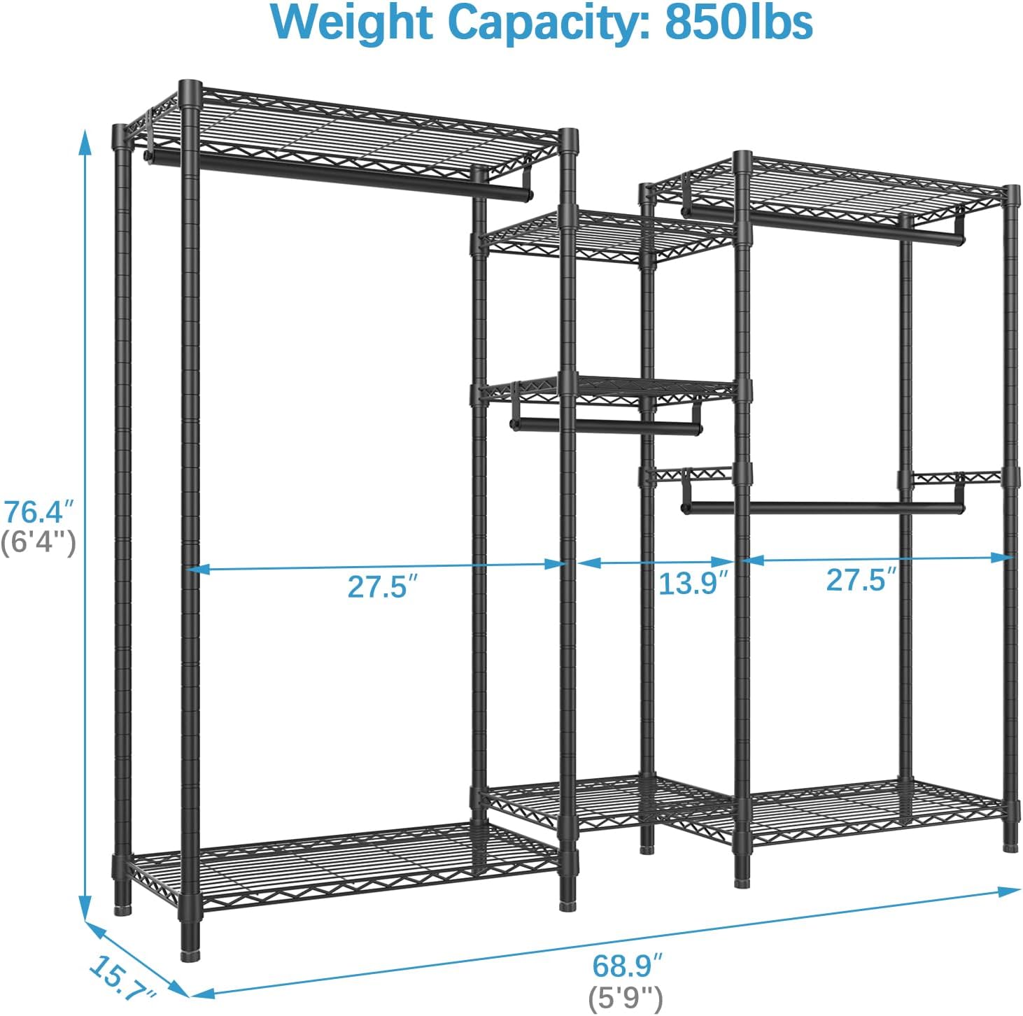 - 850 lb Weight Capacity -- The heavy duty clothing rack supports your storage needs effortlessly without bending or sagging. Ideal as a closet wardrobe, closet storage system, or free standing closet system for bedrooms and walk-in closets
