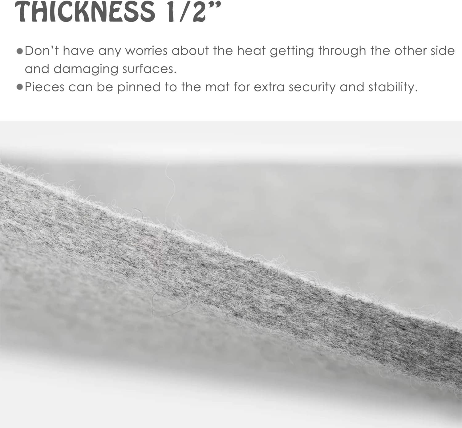 - PROTECTIVE 1/2″ THICK - this magic pressing mat is 1/2 inch thick so you don’t have any worries about the heat getting through the other side and damaging surfaces. Pieces can be pinned to the mat for extra security and stability.