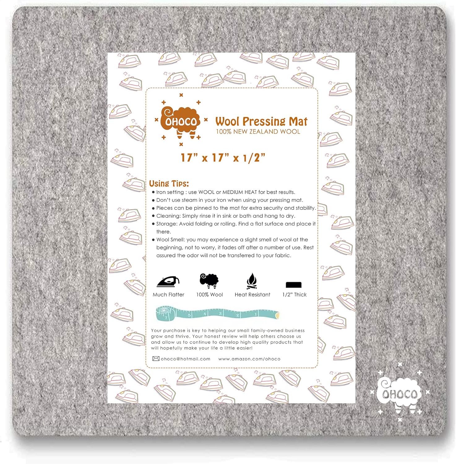 Wool Ironing Mat for Quilting - 17" x 17" XL Large Felt Ironing Pad 1/2" Thick, 100% New Zealand Wool Heat Resistant for Ironing, Sewing, Cutting on Ironing Board, Tabletop, Dryer, Countertop