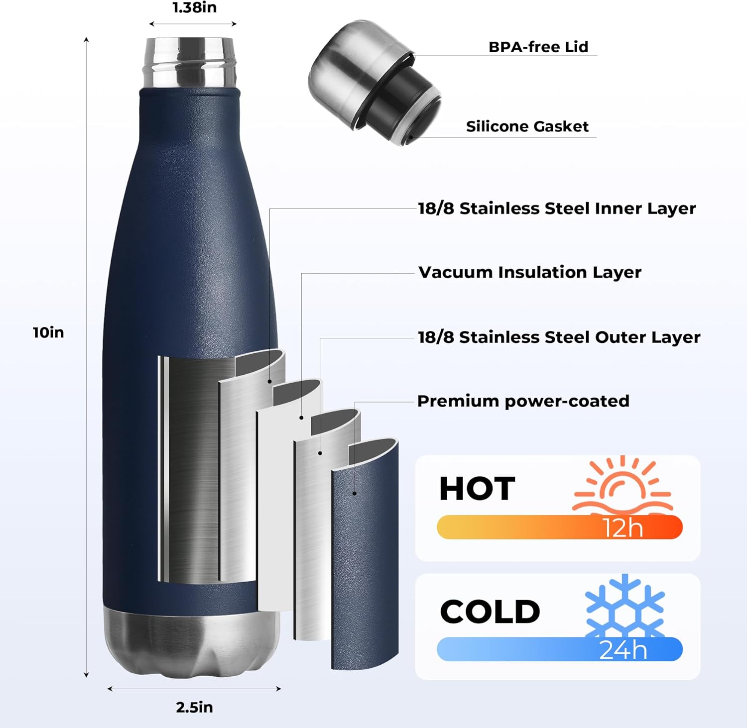 - KEEPS COLD 24 HRS, HOT 12 HR:Do you like cold drinks? hot coffee? Our double vacuum insulated stainless steel bottles allow you to enjoy cold water, juice, milk, beer or whatever you like! On cold days, you can pour in your favorite hot drinks, such as coffee or tea!your cold drink will stay perfectly chilled up to 24 hours or your coffee, tea or hot drink will keep hot for up to 12 hours. Enjoy a good day