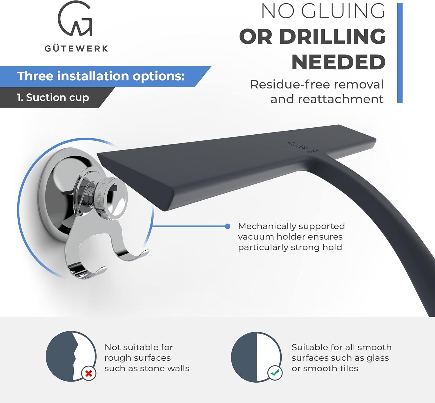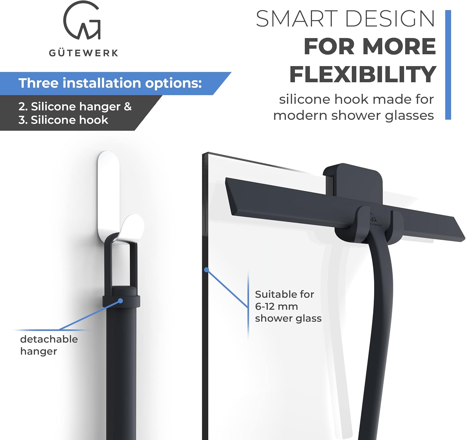 - MINIMALIST TIMELESS DESIGN - The GÜTEWERK glass squeegee is crafted with a matte black finish that impresses with its elegant timeless and smart design. In addition, the chrome-colored stainless-steel hook integrates well with any modern bathroom.