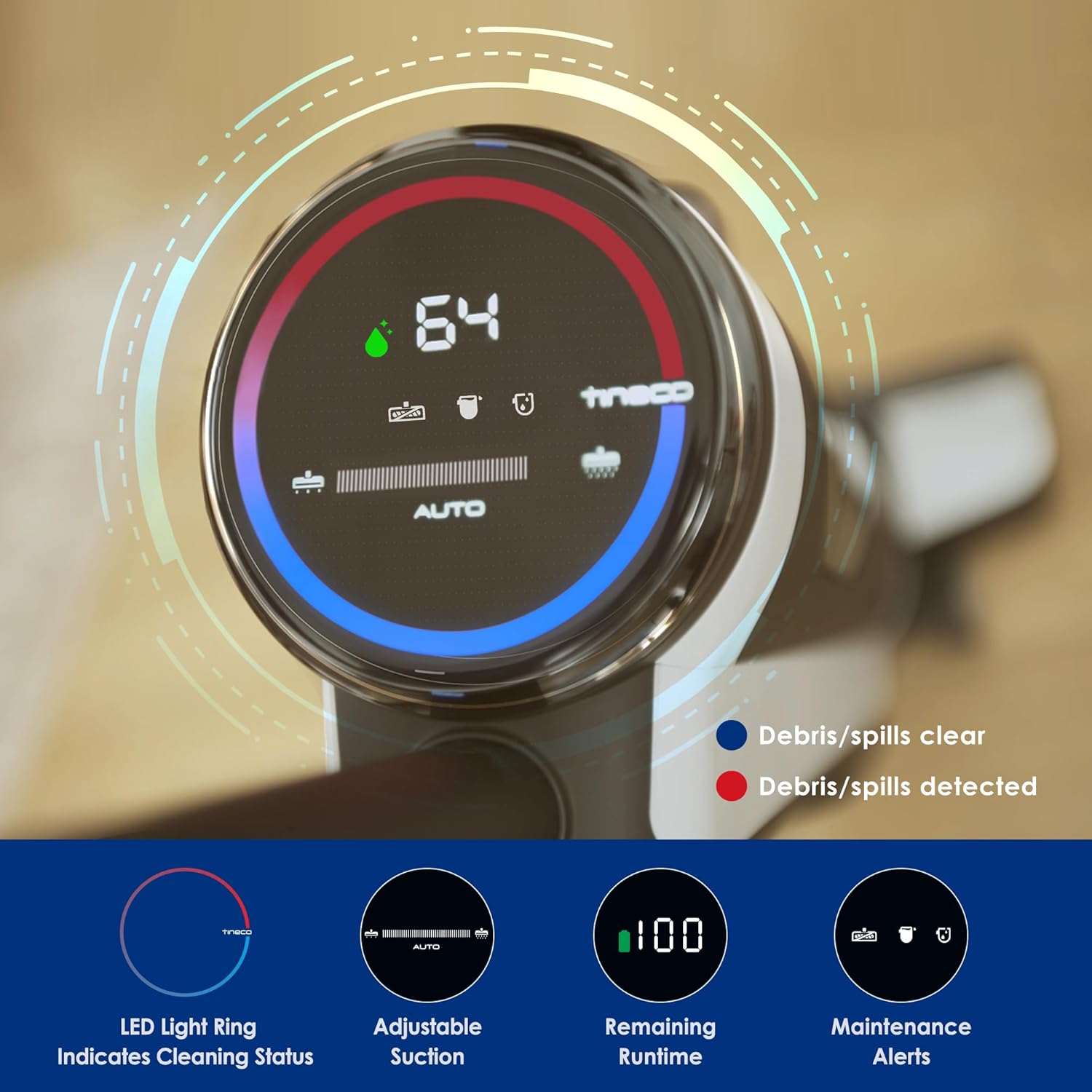 - All-in-one LED display and helpful voice assistant monitors cleaning performance for the ultimate hard floor cleaning experience. Please note that the machine must use the Tineco solution to ensure long-term use. The use of non-Tineco solution will cause corrosion and damage to the machine.