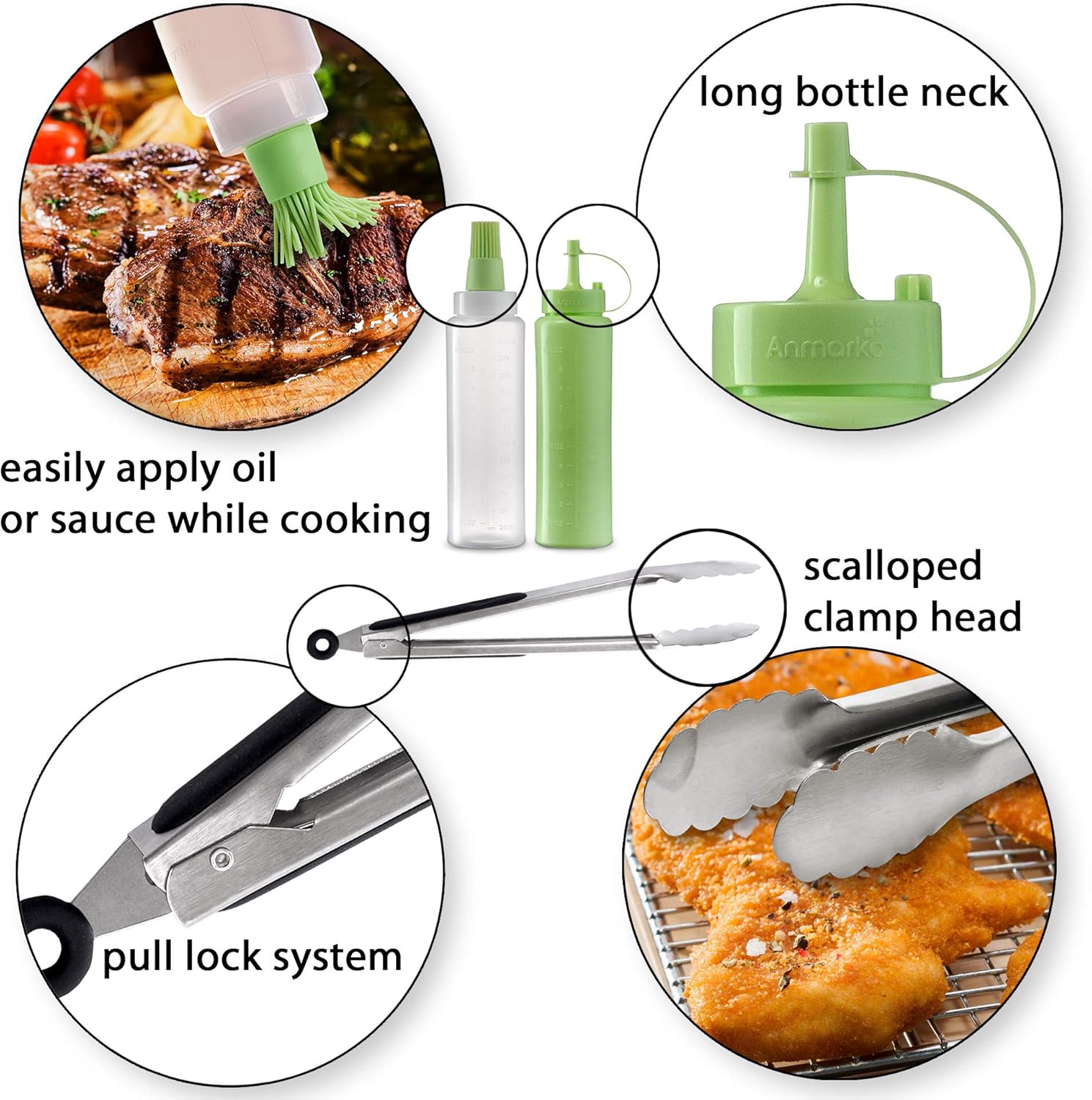 - Professional Stainless steel spatula set - includes 1 x cooking spatula turner, 1 x grill spatula, 1 x hamburger turner 4 x 8 inch, 1 x griddle scraper, 1 x grill tongs, 2 x squeeze bottles with silicone brush lid.