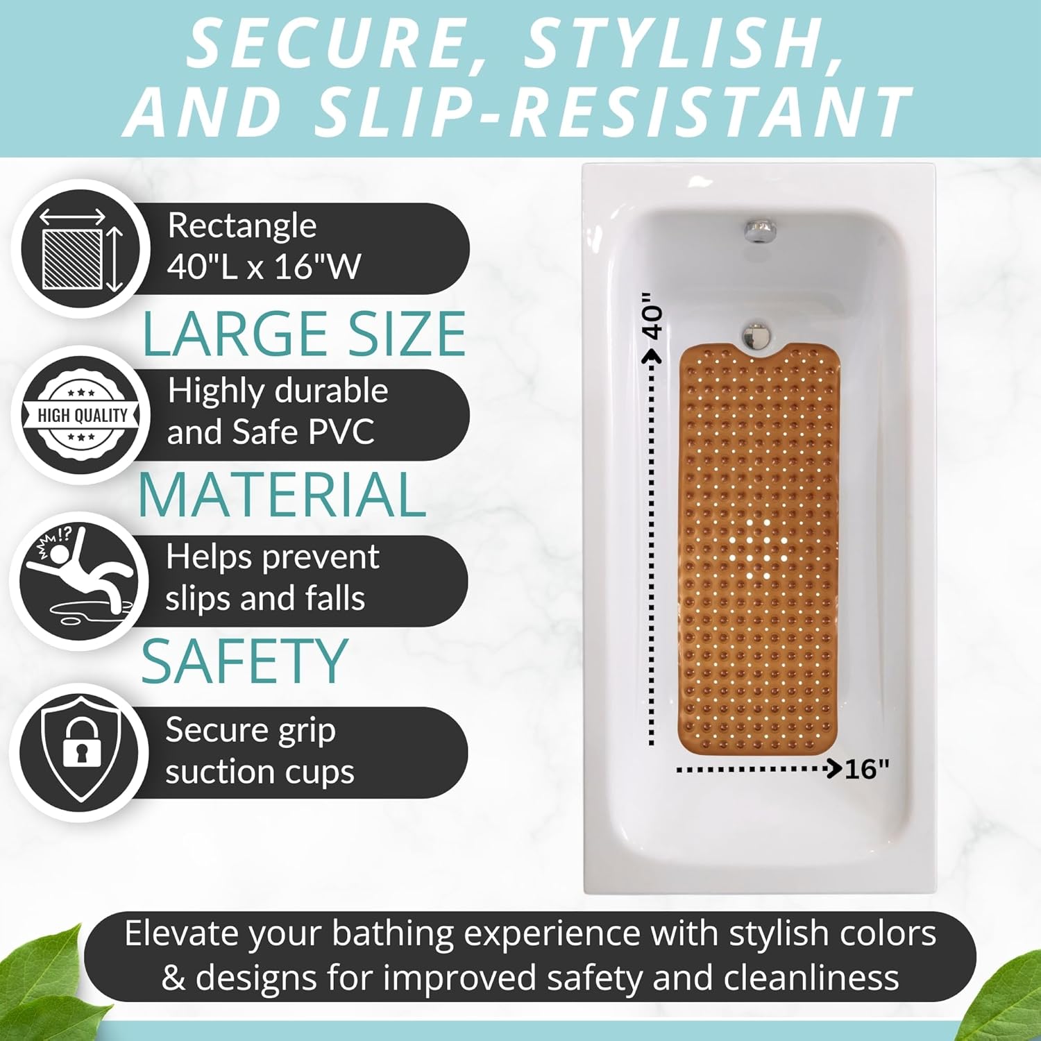 ENKOSI Bath Mat - Large Non Slip Bathtub & Shower Mat - Extra Long 40 x 16 Inch Bathroom Mats for Tub Nonslip Anti Slip Bathmats (40x16 Clear Brown 1-Pack)