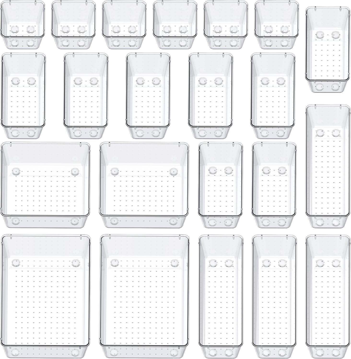 - Multiple Sizes - 5 different sizes and 22 pieces trays offer you customize combinations to store stuff and organize drawer for your specific needs. Size: 8.9 x 5.9 x 2.2 inches (2 pack), 8.9 x 3.0 x 2.2 inches(4 pack), 5.9 x 5.9 x 2.2 inches(2 pack), 5.9 x 3.0 x 2.2 inches(8 pack), 3.0 x 3.0 x 2.2 inches(6 pack).