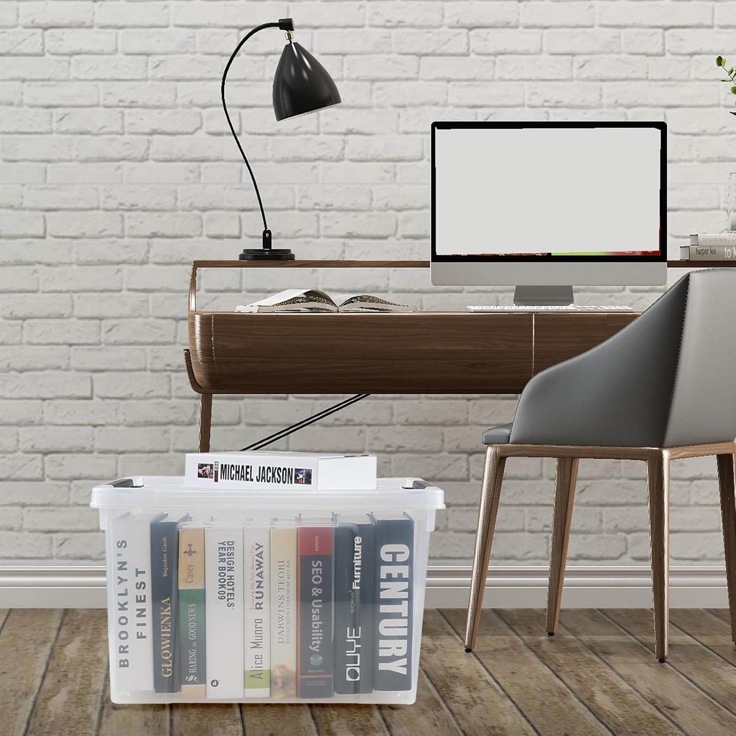 - Sturdy clear plastic storage bin with black latch to securely hold your items inside