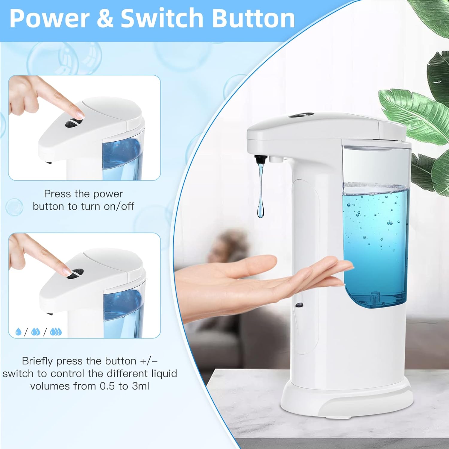 - 【Adjustable Soap Output Volume】: Features 3 different liquid dispensing volume settings, the no-touch soap dispenser allows us to set our desired volume easily by pressing the “+/-” buttons, so we make full use of the soap without waste!
