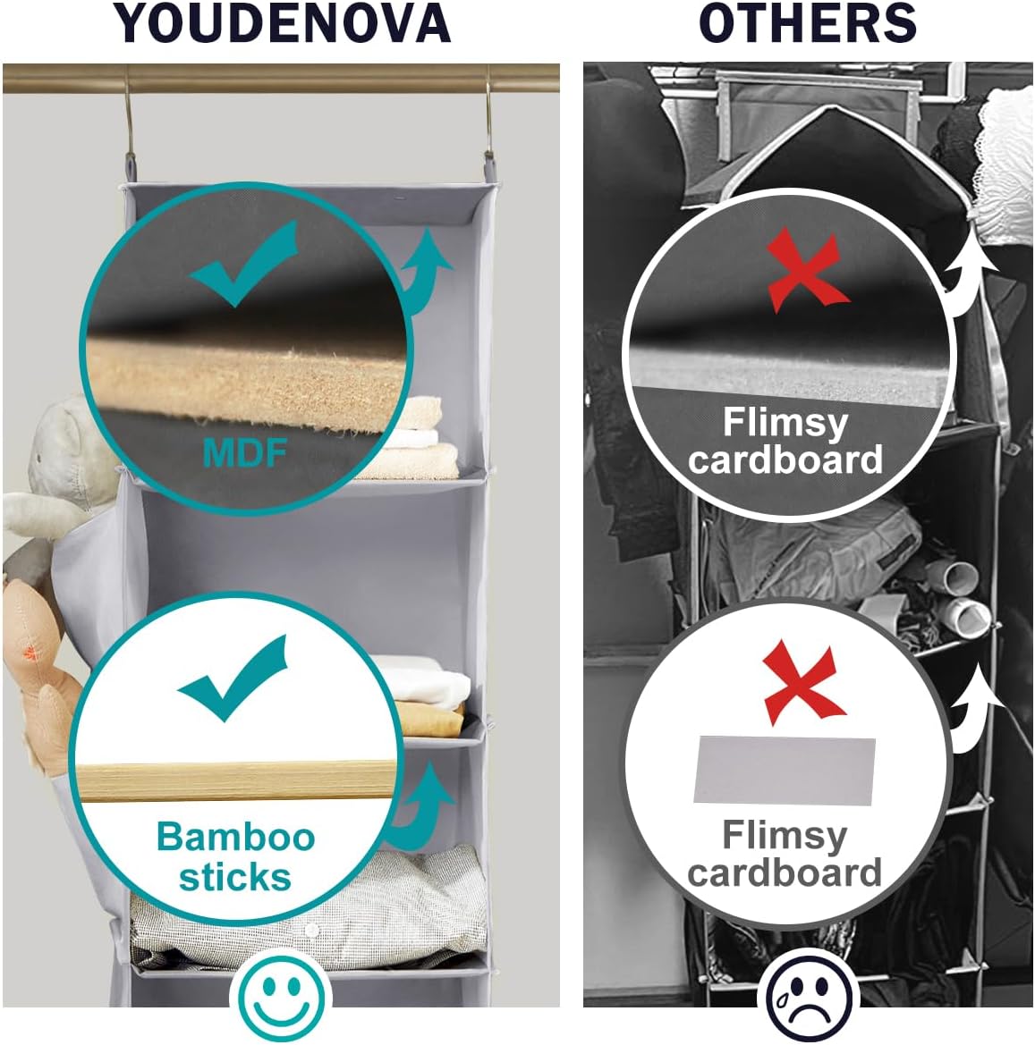 YOUDENOVA Hanging Closet Organizer and Storage, 6-Shelf Closet Hanging Shelves | Sturdy Bamboo Structure Cloth Hanging Storage, Sweater Organizer, 11.8” x 11.8” x 47.2”, Light Grey
