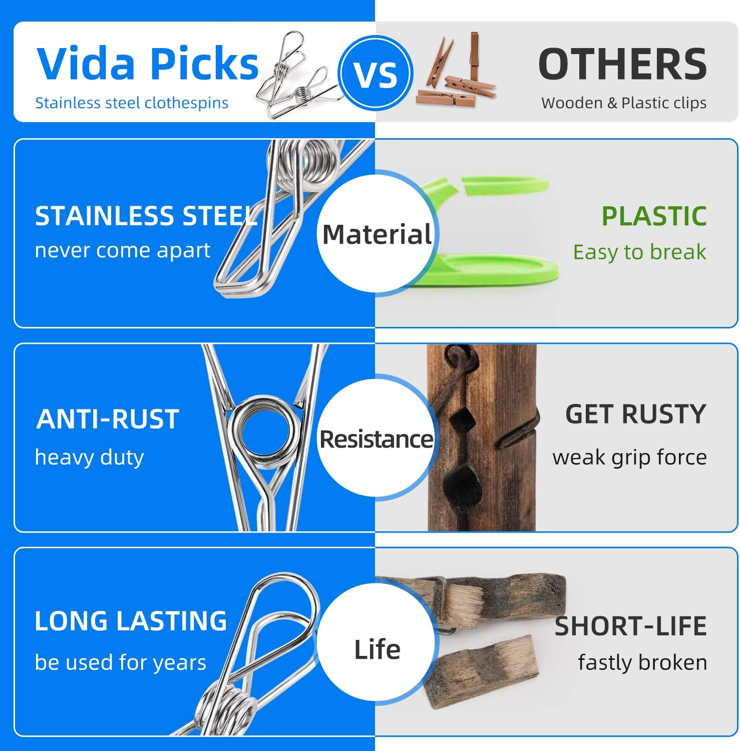 - [❤️Lifetime Guarantee]: Are you still use clothes pins wooden? Try our stainless steel clothes pins, you will never regret how well the performance of our clothes pegs. Only our clothespin can hold clothes on a line in the heavy wind! Every Vida Picks clothespin is perfect for hanging clothes outside & drying clothing, blankets, and linens & holds 10 lbs, it's also backed by a true lifetime
