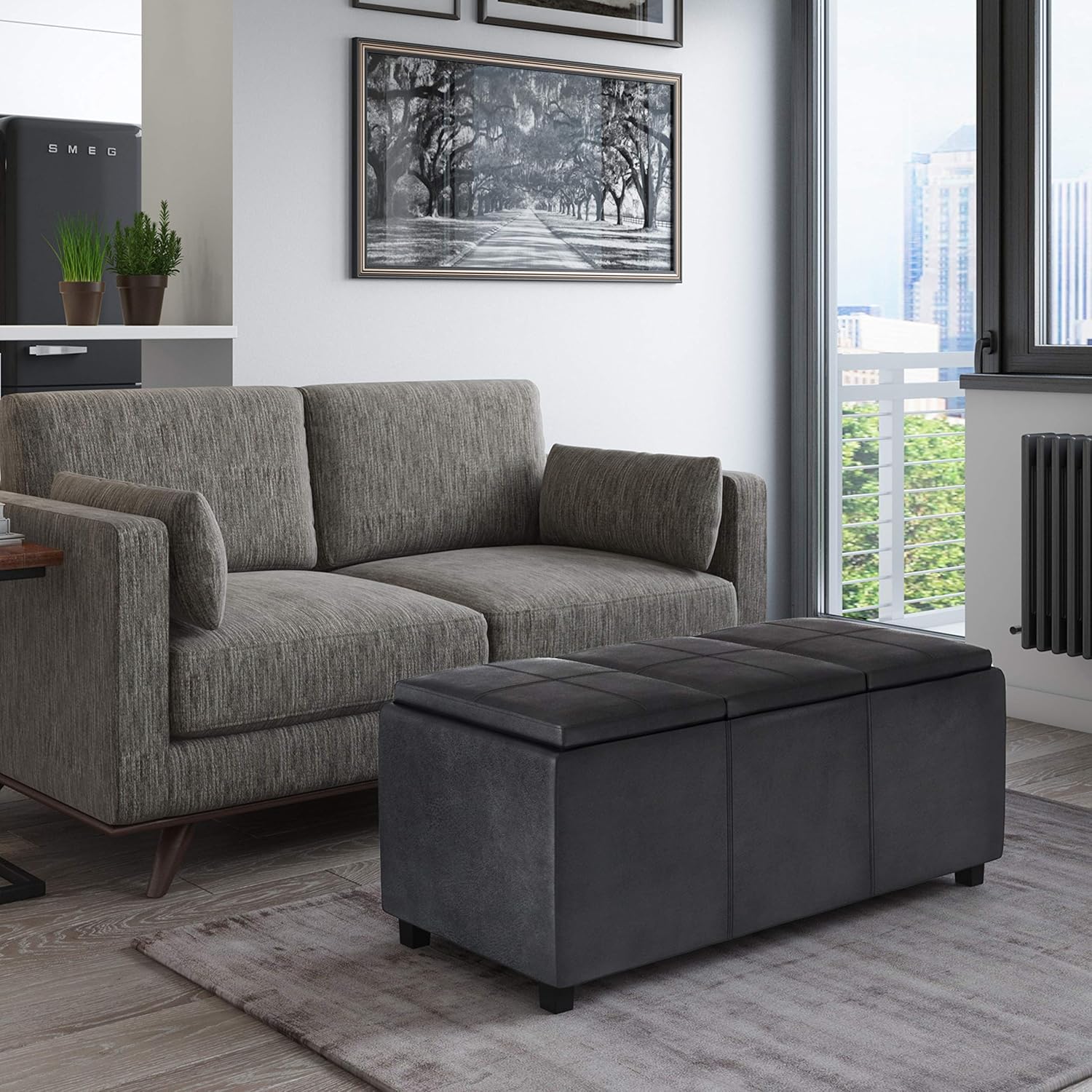 SIMPLIHOME Avalon 42 inch Wide Contemporary Rectangle Storage Ottoman in Distressed Black Vegan Faux Leather, Assembled, For the Living Room, Entryway and Family Room