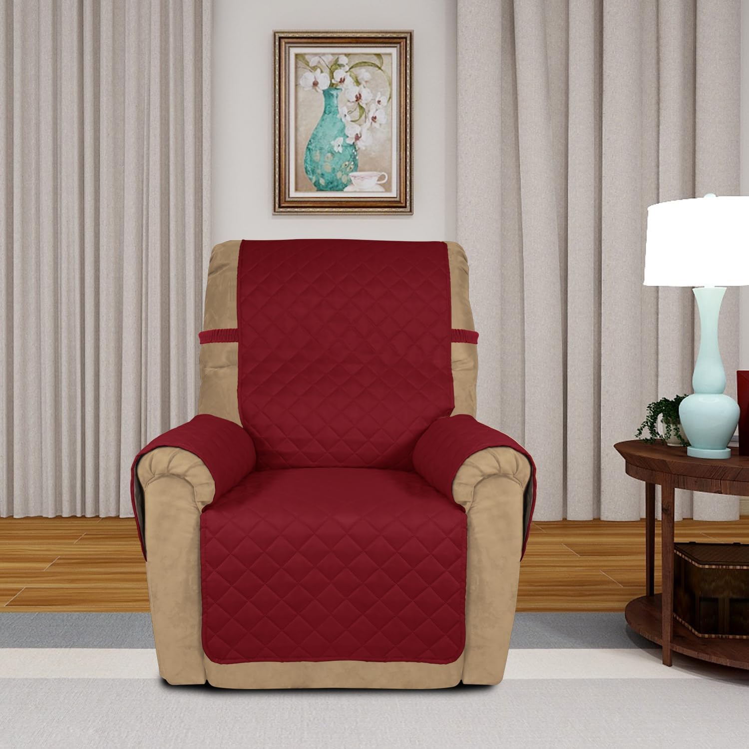 PureFit Reversible Quilted Sofa Cover, Water Resistant Slipcover Furniture Protector, Washable Couch Cover with Non Slip and Elastic Straps for Kids, Dogs, Pets (Small Recliner, Red/Ivory)