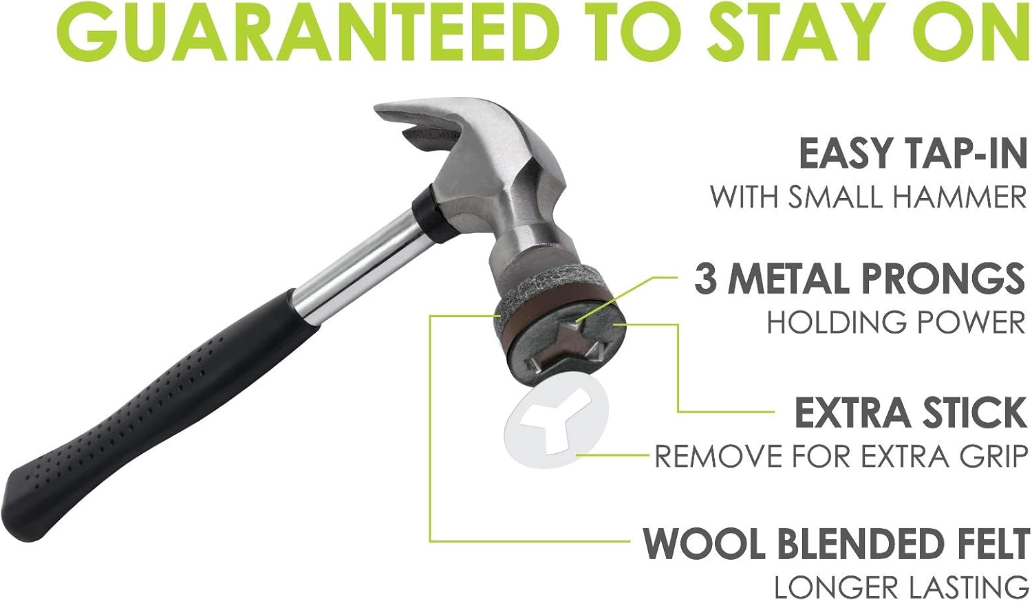 - Guaranteed to stay on furniture legs – Each tap in felt chair glide features 3 steel prongs paired with a strong self-stick adhesive backing that hangs on and won’t come off chair legs / furniture feet. These 3/4 inch felt furniture pads are designed to stay on chair legs and last longer than other felt pads. Not for use on furniture legs under 3/4" diameter at base or metal furniture legs.