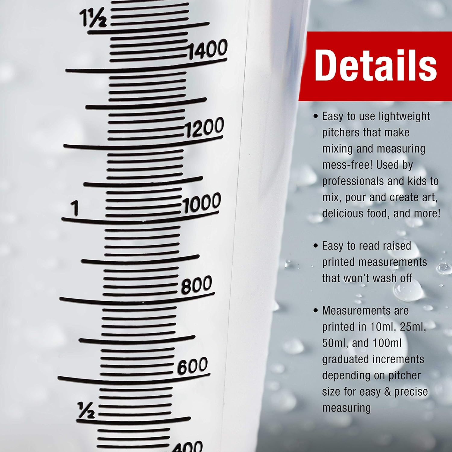 - Easy to use lightweight pitchers that make mixing, measuring and pouring mess-free! Used by professionals and kids to mix, pour and create art, delicious food, and more!