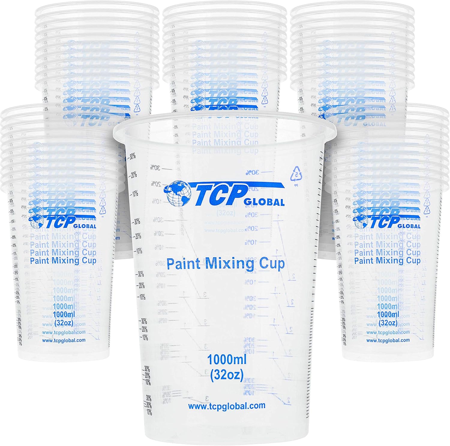 TCP Global 32 oz. (1000ml) Graduated Plastic Mixing Cups (Box of 50) - Disposable Plastic Measuring Cups for Liquids, Paints, Resin, Epoxy, Art, Kitchen - Ratios 2-1, 3-1, 4-1 ML