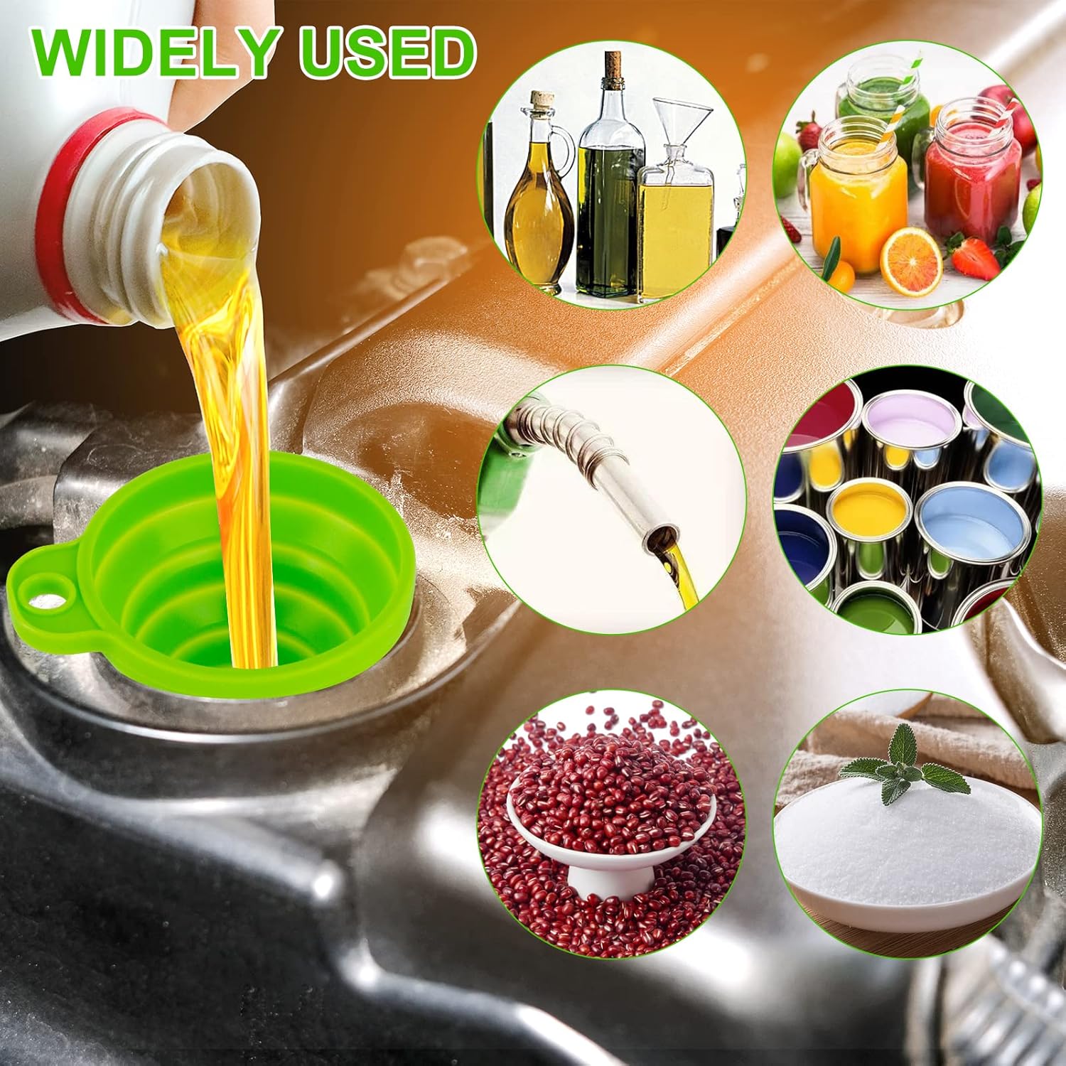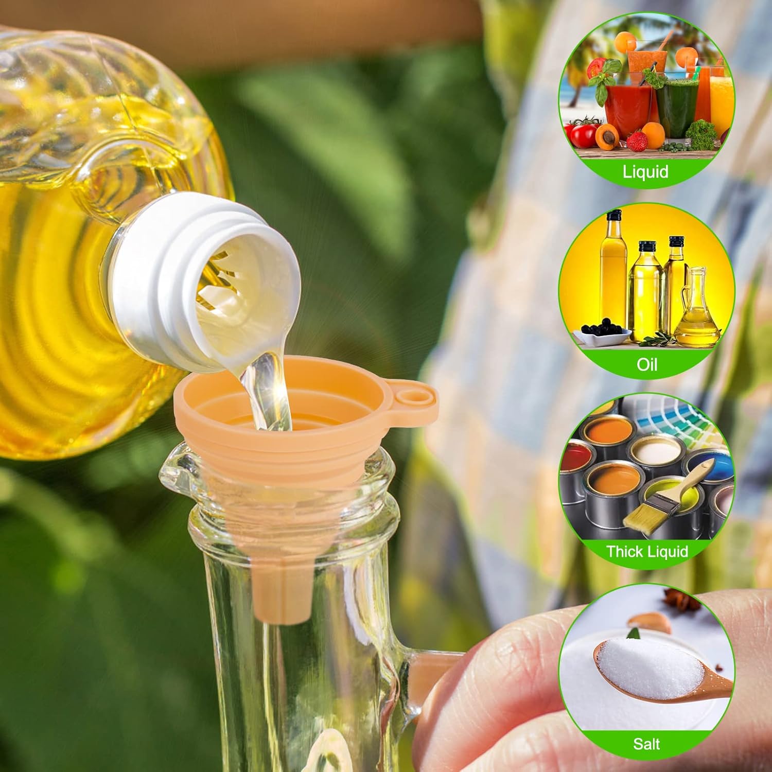 - 【Food Grade Kitchen Funnel Set】Soft and flexible funnels for kitchen use, premium food-Grade silicone, BPA Free, heat resistant -40°C to 250°C. No need to worry that the old plastic funnel may damage the health of your families.