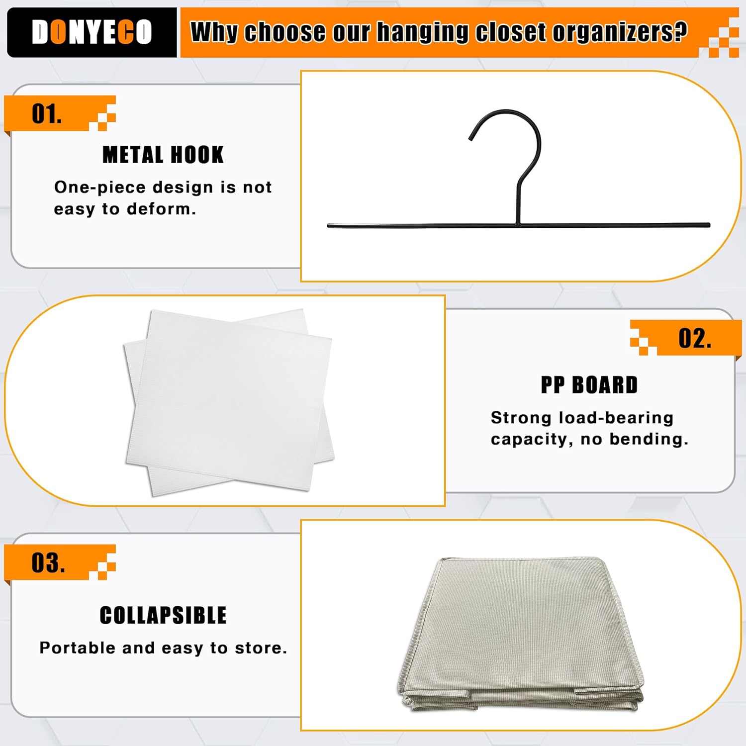 - 【Sturdy and durable】2 sturdy rods and 2 durable metal hooks, with 6 PP panels in the compartment for firm support.
