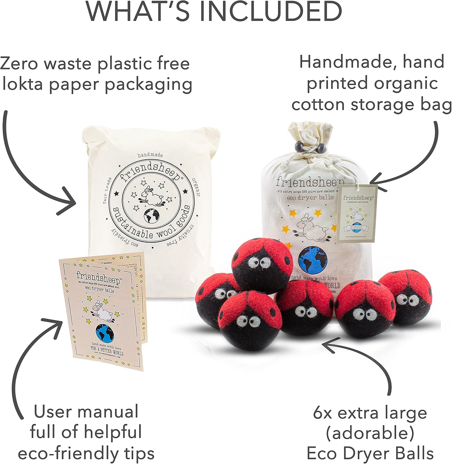 Friendsheep Wool Dryer Balls 6 Pack XL Organic Premium Reusable Cruelty Free Handmade Fair Trade No Lint Fabric Softener Ladybugs - Laundrybugs