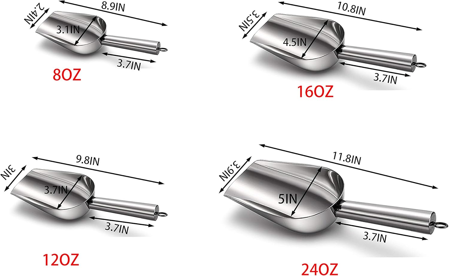 - Include 4 pack ice scoop: 8oz, 12oz, 16oz, 24oz, different volume for you to choose, which can meet your different needs, perfect for buffet, ice cube, flour, sugar, powders, cereal loops, baking ingredients, dry goods, popcorn bar, grocery store and more.